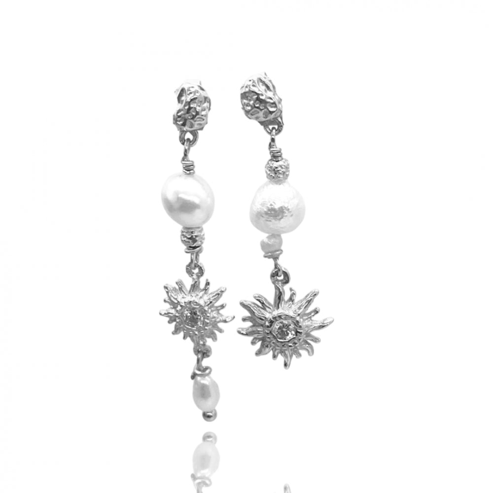 Fantasifulde øreringe i asymmetrisk look og med de fineste solvedhæng - skab et fint skinnende look med væres funklende nyhed! Et strejf af sol og hav. Sunkissed Earrings er inspireret af varme sommerdage, hvor solen kysser huden, og havet glimter i horisonten. De asymmetriske detaljer med unikke ferskvandsperler og gyldne sol-vedhæng giver et drømmende og kunstnerisk udtryk – perfekt til dig, der elsker et feminint, legende og personligt look.