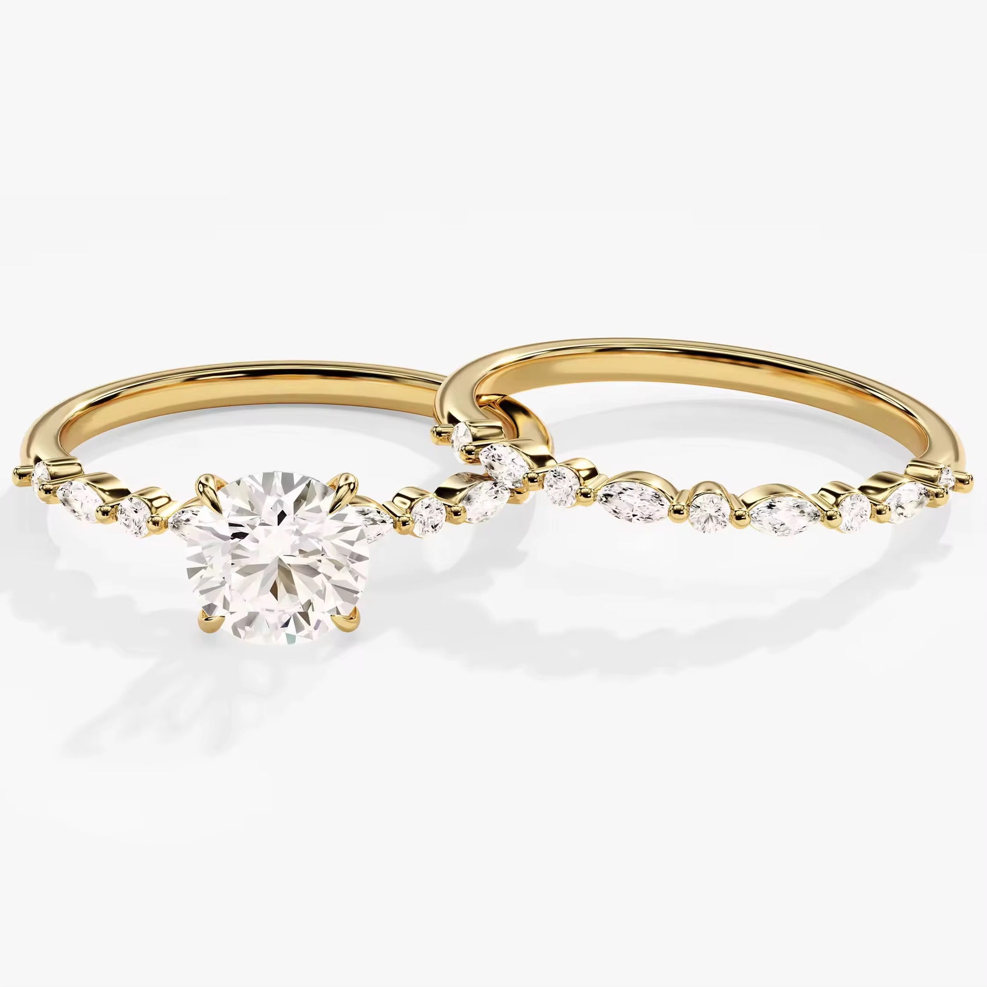 Forlovelsesringen prydes af en strålende rund lab-grown diamant, der holdes sikkert af fine grabber og fremhæves af diskrete sidesten langs ringskinnen. Den tilhørende ring er besat med nøje udvalgte brillantslebne diamanter, der smukt følger fingeren og fuldender helhedsudtrykket.